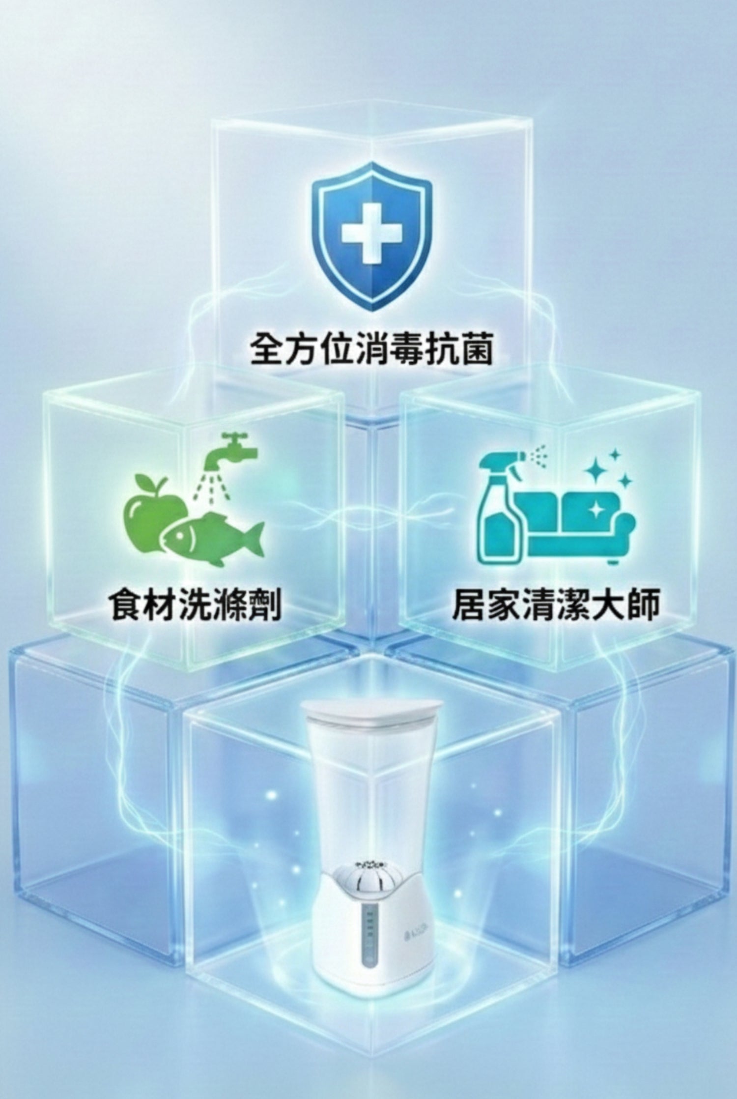 用食鹽 + 自來水 + 電解 即可以無限量生產 消毒抗菌液 食物洗滌劑 漂白去黴劑 防腐除臭劑